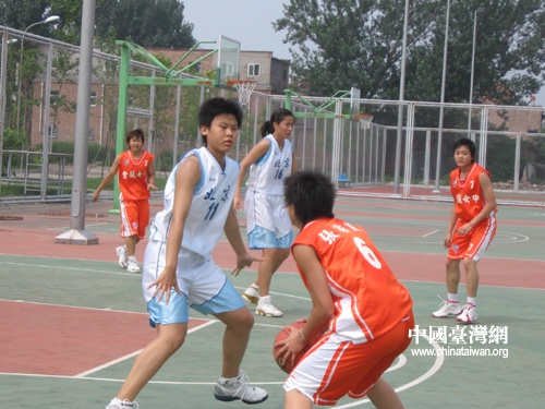在參觀完101中學(xué)后,臺(tái)灣金甌女中女籃隊(duì)和清華附中女籃隊(duì)友誼比賽在露天的場(chǎng)上展開(kāi),激烈的對(duì)抗,悶熱的天氣,雙方隊(duì)員都揮汗如雨,但完全不能緩慢場(chǎng)上的廝殺的節(jié)奏。矯健的身姿穿梭在球場(chǎng)上,強(qiáng)悍的球風(fēng),完全沒(méi)有了女孩的柔弱。精彩的場(chǎng)面,引發(fā)場(chǎng)下同學(xué)的陣陣喝彩,加油聲一浪高過(guò)一浪,場(chǎng)面熱鬧非凡!
