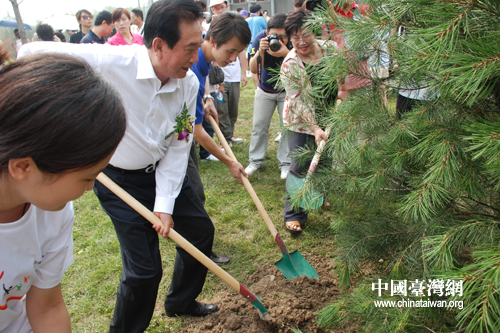 海協(xié)會會長陳云林和臺灣師生共同為“京臺青年友誼林”植下了象征兩岸友誼地久天長的松樹。(中國臺灣網(wǎng) 于斯文 攝)