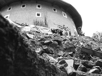 受持續強降雨的影響,田螺坑土樓群于數日前開始出現樓群護坡變形,多處山體滑坡,并最終造成瑞云樓下方的擋土墻發生大面積坍塌,對土樓地基構成嚴重威脅(見左圖)。目前,國家文物局研究所已經派出專家組抵達現場勘察,研究制定詳細的搶救方案。
