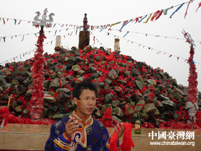 蒙族小伙子在向記者們介紹“敖包”的來歷。敖包,又稱“鄂博”、“石堆”、“鼓包”等,在蒙古牧人看來是神圣之所在。祭敖包是蒙古民族薩滿教隆重的祭祀之一。