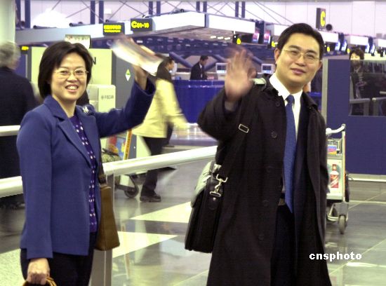 資料圖:大陸首批赴臺駐點采訪記者2001年2月8日離開北京,新華社記者范麗青和陳斌華清晨乘CA101航班飛經(jīng)香港,當天抵達臺北,開始新世紀臺海兩岸倍受關(guān)注的新聞之行。 中新社發(fā) 賈國榮 攝