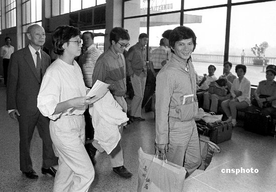資料圖:一九八七年九月,臺灣《自立晚報》記者李永得和徐璐繞道日本飛抵北京,成為自一九四九年以來首次到祖國大陸采訪的臺灣記者。 中新社發 黃云生 攝