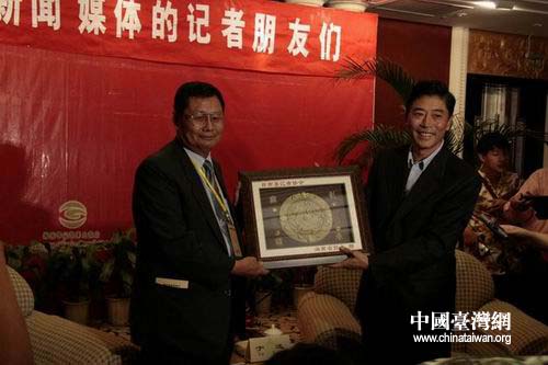 海南省委副書記于迅(右)與臺灣媒體記者團長黃瑩輝互贈禮品
