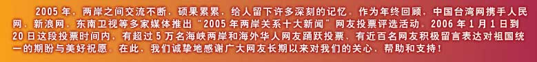1月29日,2005年臺商春節包機啟動,首次實現了"共同參與、多點開放、直接對飛、雙向載客"。大陸民航飛機在兩岸分隔56年后,首度降落臺灣。 |