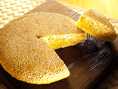表面鋪滿整層厚密香酥白芝麻,餅內特選以上等蛋黃、果仁入餡,經過特別處理制作而成。適當的低甜度,咬下去即感受一股濃密芝麻香味撲鼻而來,風味獨特,香酥而不過甜。
