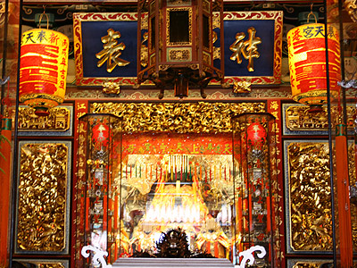奉天宮正殿主祀圣母媽祖,后殿主祀觀音菩薩,配祀文殊、普賢,左奉福德正神,右為注生娘娘及八位娘娘;左、右翼殿配祀文昌帝君及關(guān)圣帝君;左、右護(hù)龍廳則供奉笨港城隍及功德主王得祿、檀越主林溪和等長生祿位;第四進(jìn)則為新建的凌霄寶殿。