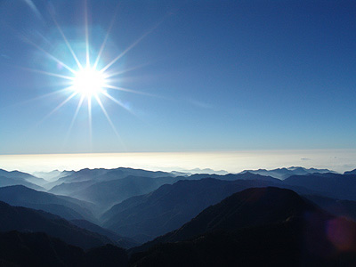 登頂的時候,天氣非常好,向東望去,就是十峻之首的玉山東峰,猙獰的斷崕巖石地形,氣勢非凡。遠方的山巒間是急速翻攪奔騰的云海,在這里看來,卻是如此平靜,馬博拉斯、秀姑巒山、大關山、新康山...等百岳,一做一做的從南到北浮在云上。南方與西方天際與山脈的交接處,云似乎是沈穩而安靜的,水平的橫臥在群峰之間,分成好幾個層次,從淡到深、漸遠漸輕,蒙蒙寧靜的水藍,像是國畫的渲染技法,有種單純的美感,細致而淡雅。