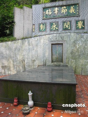 昔日上海灘大亨杜月笙之墓位于臺北縣汐止“秀峰國小”后山。蔣中正題“義節秉昭”、張群題“譽聞永彰”金色挽額,作為背景映襯灰黑色的墓碑。墓碑上刻有宋體楷書金字“先考杜公月笙府君之墓”。據記載,杜月笙一九五一年逝世于香港,一九五三年安葬于臺灣。 中新社發 許曉青
