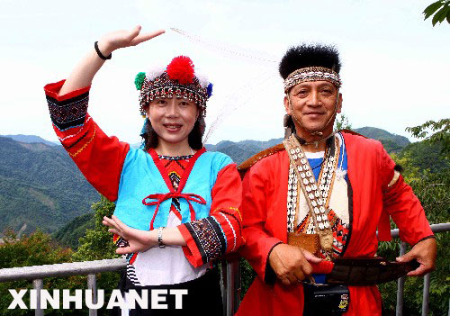 大陸游客“客串”臺灣少數民族族群 7月7日,一位來自北京的游客(左)在臺灣嘉義縣阿里山鄉樂野村,與臺灣鄒族長老湯進賢一起展示鄒族服飾。鄒族是臺灣少數民族族群之一,目前人數有7000多人,大多以務農為生。 新華社記者 陳建力 攝