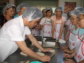 張經(jīng)理講述了全麥土司面包的制作方法,從攪拌、發(fā)酵、面團整形到烤焙與冷卻。在聽完張經(jīng)理的講述后,大家來到各組的操作臺,在張經(jīng)理的示范下,將已經(jīng)用機器攪拌與發(fā)酵好的面團進行實際“面團整形”操作工序。只見張經(jīng)理嫻熟的將一個大面團分為6個450克的小面團,然后將每個小面團團圓后搟平,然后反方向卷起,成卷狀,面卷表面光滑兩端平整,然后將面卷放到烘焙槽內(nèi),此道工序完畢,大家看后興趣盎然,充滿著好奇,都想馬上一展身手。看似簡單的操作,可是自己真正操作起來就不像想象的那樣簡單了。這時的面團不像在張經(jīng)理手里那樣的“乖巧”了,就拿最簡單的稱重來說吧,將大面團分為6個450克的小面團,只見大家用刀切一塊在秤上稱一下,不夠重,再切一小塊還不夠重,再切一小塊又超重了,再切下一塊,就這樣450克的面團被大家分了好幾小塊才夠重量,這時的大家已經(jīng)沒有了那時“輕敵”的心態(tài)了,王梵明總經(jīng)理與張經(jīng)理又具體示范了成比例切面團的方法,大家試過后很“見效”,雖然達不到王總與張經(jīng)理“一刀切準”的境界,但是也是熟練了很多。面團分割好后,將面團搟平卷起,看大家卷的面團,真是千姿百態(tài),面卷的兩端參差不齊,在王總與張經(jīng)理一一修改后,漂亮的土司面包初具成形,這時的土司面包就可以進烤箱了,大家都在翹首期盼勝利的果實。在等待土司面包出爐的過程中,張經(jīng)理與王總又給大家講述與示范了小的甜面包的制作方法,只見王總把小面團放在操作臺上,用大拇指往里按壓轉了幾下,一個表面光滑圓圓的面團成形了,大家看到王總的操作真是“出神入畫”,無不驚嘆!在制作土司面包的基礎上,大家有了一些經(jīng)驗,在切割面團的時候已經(jīng)比較熟練了,但將面團團圓太不容易了,面團在操作臺上根本不聽大拇指的話,不是粘在操作臺上,就是不知面團轉到什么方向去了,最后經(jīng)過相互揣摩其中的奧妙,汲取經(jīng)驗,總算是找到了技巧,一個個圓圓的面團呈現(xiàn)在面前,大家充滿著喜悅。在操作過程中大家互相交流心得,相互鼓勵,虛心向王總與張經(jīng)理求教,不僅學習了土司面包與甜面包的制作,還學習了可可酥及奶油酥的制作方法。下午3點30分,看到自己一天的成果-土司面包、甜面包、可可酥、奶油酥,太太們無不歡喜鵲悅,紛紛在自己的成果前合影留念,在分享喜悅的同時,更是虛心求教,拿著自己的成果讓王總與張經(jīng)理點評,汲取經(jīng)驗改進不足。下午4:30太太們帶著愉快的心情,載著自己豐碩勝利的果實結束了一天的烘焙培訓活動。