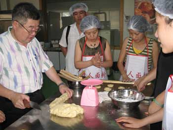 在聽完張經(jīng)理有關面包的故事后,大家迎來了“夢寐以求”的實際操作。只見大家戴上了大成公司事先為大家準備好的嶄新潔白的圍裙,戴上白色的工作帽,這時的臺商太太們已昔如往日,儼然成為了“大師傅”的樣子。張經(jīng)理將大家分為了四組,在他的帶領下,來到了烘焙教室的操作廳。