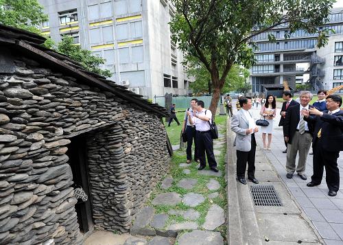 9月23日,大陸少數民族大學生文化交流團成員在臺灣實踐大學校園內參觀臺灣少數民族石板屋。新華社發(吳景騰 攝)