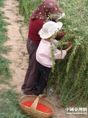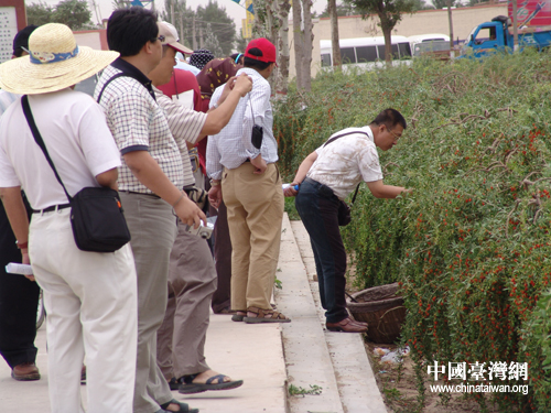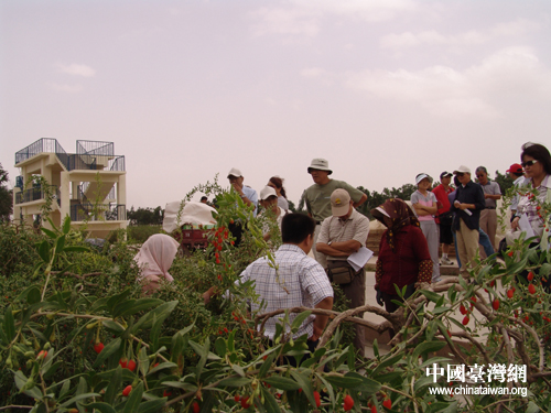 7月10日,在寧夏參加“海峽兩岸記者聯合采訪活動”的兩岸記者一行參觀采訪中寧縣萬畝枸杞園。