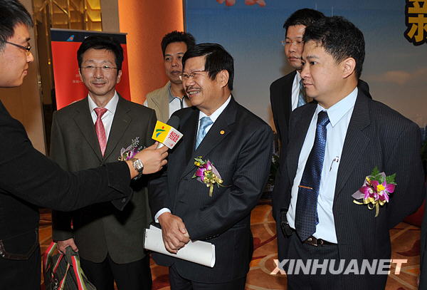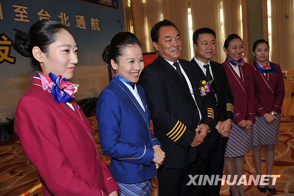 12月10日,南航首次直航臺北的機長劉湘衡(左三)和乘務長石菁(左二)率領部分機組人員出席新聞發布會。中國南方航空公司將于12月18日執行兩岸直航包機任務。南航深圳至臺北直航包機為每周兩班,逢周四、周六執行。新華社記者壯錦攝