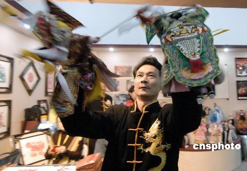 十一月二十八日,福建漳州木偶劇團的演員在首屆兩岸文博會上表演布袋木偶戲。海峽兩岸各種文化產(chǎn)業(yè)在為期四天的首屆海峽兩岸文化產(chǎn)業(yè)博覽交易會上集中亮相。 中新社發(fā) 王東明 攝