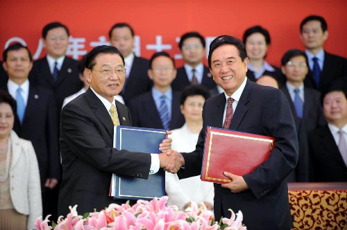 資料圖片:6月13日9時許,海協會與海基會在北京就兩岸周末包機與大陸居民赴臺旅游簽署協議。這是海協會會長陳云林和海基會董事長江丙坤在簽字儀式上握手。 新華社記者李曉果攝