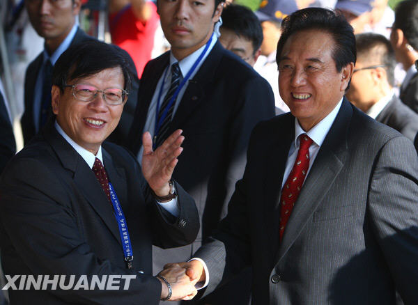 11月5日,陳云林(右)和新竹科學工業(yè)園區(qū)管理局局長顏宗明握手。當日,海協(xié)會會長陳云林參觀新竹科學工業(yè)園區(qū)。新華社記者 邢廣利 攝