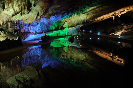 水洞“小三峽”兩岸奇峰聳峙,怪石猙獰,河水夏日冰冷徹骨;干洞和迷津洞內鐘乳石保存完好,奇形怪狀,千姿百態,巨柱擎天、長龍橫臥、雄鷹高踞,帷帽低垂,百步天梯,水鏡仙境,美不勝收。不過,龍麟宮最讓人震驚的景觀是里面的魔幻倒影,在一處平靜如鏡的水面上,倒映出大峽谷、兵馬俑、美女寶馬等景觀,美侖美奐。肖進安 攝