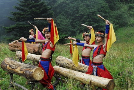 梆鼓,是遠古時期神農架山民驅趕野獸,保護莊稼不受損害的一種敲擊物。后來山民們用它傳遞情愛,打發漫漫長夜的寂寞。隨后,梆鼓又成為神農架人在喜慶的日子里擂動情緒、渲染氣氛的一種樂器。神農架梆鼓留下了神農架人民千百年來的期盼與向往,展示出原始山民豪放不羈的萬種風情。