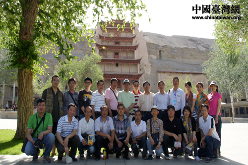 2012年海峽兩岸新聞媒體“陸上三峽行”采訪團在敦煌莫高窟合影。(中國臺灣網(wǎng)發(fā))