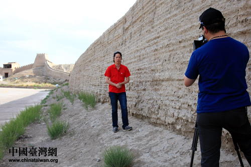 臺灣記者何勁松和方昶懿在嘉峪關拍攝畫面。(中國臺灣網(wǎng) 郜利敏 攝)