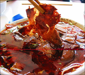 如果油溫不夠,再用微火加熱,其間,要用鏟子不停地?cái)噭?dòng),讓溫油慢慢浸燙出辣椒和香料的味與色來(lái),待到色澤紅透、椒香撲鼻之時(shí),將煉制紅油的鍋移至一旁,讓其慢慢冷卻。如嫌這樣煉出的紅油,香味還不夠濃烈,也可根據(jù)需要,在煉制過(guò)程中,加入八角、豆蔻之類(lèi)。如何取舍,要看煉制的紅油作何所用,如是做涼菜的佐料,太重的香料氣息,反而會(huì)掩去菜肴的本味。