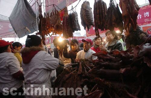 1月2日,在成都市萬達廣場,臺灣小吃攤位生意紅火。 新華社記者 江宏景 攝 1月1日,2009成都臺灣風情周在成都萬達廣場拉開帷幕,130個小吃攤位、30多種臺灣小吃現做現賣,還有臺灣民間藝人的風情表演,現場游人絡繹不絕。 1月2日,幾位成都市民在采購年貨。隨著春節的臨近,許多市民利用元旦假期開始選購年貨,為過農歷新年做準備。 新華社記者 江宏景 攝