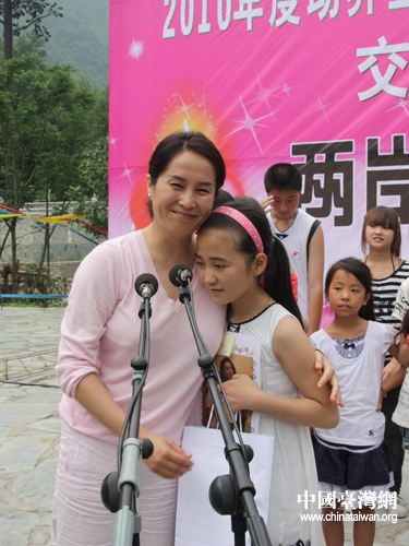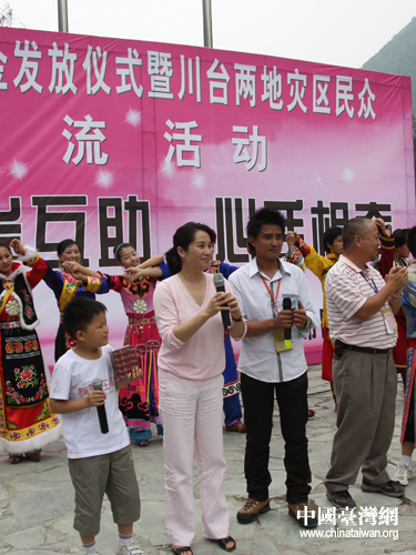 在吉娜羌寨,兩地災(zāi)區(qū)少數(shù)民族還同臺(tái)演出,北川擂鼓小學(xué)的同學(xué)與來(lái)自臺(tái)灣阿里山鄉(xiāng)達(dá)邦小學(xué)、屏東縣泰武小學(xué)的同學(xué)共同為大家演繹了兩岸少數(shù)民族文化。活動(dòng)最后,四川抗震小英雄林浩、臺(tái)灣“8.8”風(fēng)災(zāi)抗災(zāi)英雄賴孟傳及兩地災(zāi)區(qū)民眾合唱《我們都是一家人》。