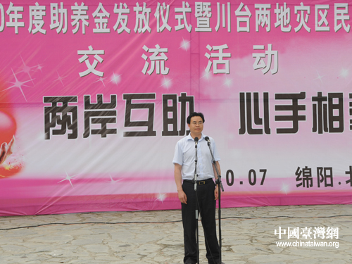四川省臺(tái)辦副主任張軍在“2010年度助養(yǎng)金發(fā)放儀式暨川臺(tái)兩地災(zāi)區(qū)民眾交流活動(dòng)”上致辭(中國(guó)臺(tái)灣網(wǎng) 宿靜 攝)