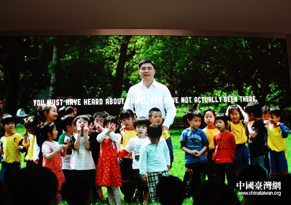 臺北市長郝龍斌也和小朋友們一起,通過宣傳片歡迎人們來到臺北館。(中國臺灣網 張弛 攝)