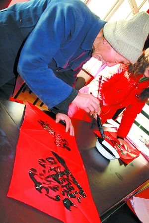 延慶縣康莊鎮大豐營村老書法愛好者為鄰里寫春聯。郭明旺攝