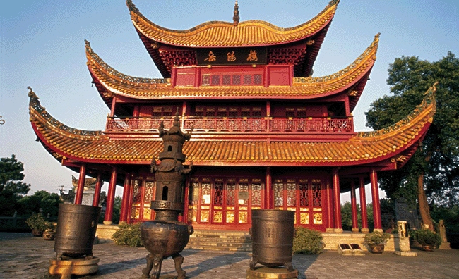 素有"洞庭天下水,岳陽天下樓"盛譽的岳陽樓踞于岳陽古城的西門之上,其氣勢之壯闊,構制之雄偉,堪稱江南三大名樓之首. 名冠天下的岳陽樓構制獨特,風格奇異.樓三層、飛檐、盔頂、純木結構. 全樓高達25.35米,平面呈長方形,寬17.2米,進深15.6米,占地251平方米.樓中四柱高聳,樓頂檐牙啄,金碧輝煌.遠遠而瞭,恰似一只凌空欲飛的鯤鵬,尤顯雄偉壯麗。