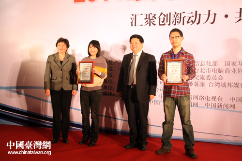 國臺辦主任助理龍明彪為2011年第二屆兩岸數字內容設計大賽最終的獲獎者頒獎。(中國臺灣 于斯文 攝)