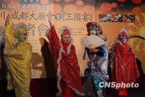 5月20日,來自四川的演員在臺(tái)北的成都大廟會(huì)記者會(huì)上表演川劇變臉。名列大陸四大廟會(huì)之一的四川成都大廟會(huì),首度跨海來臺(tái)展示四川最具代表性的非物質(zhì)文化遺產(chǎn),21日將在臺(tái)北登場。中新社發(fā) 羅欽文 攝