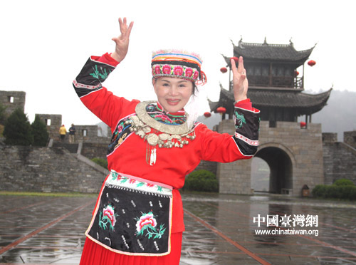 臺灣客人對少數民族服飾興趣很濃,圖為一位參訪團成員穿戴苗族衣飾拍照留念!(中國臺灣網 李杰 攝)