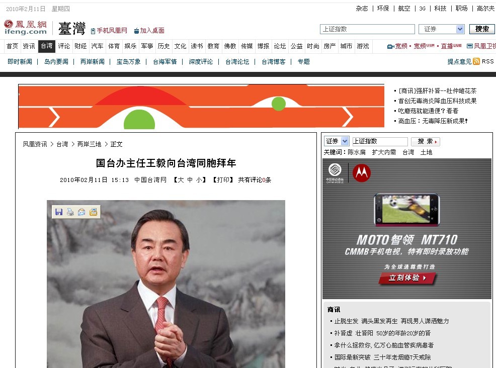 2010年2月11日,中共中央臺辦、國務院臺辦主任王毅通過中國臺灣網向臺灣同胞拜年。(中國臺灣網 田云鵬 攝)