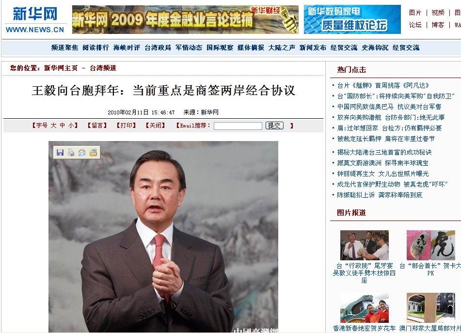 2010年2月11日,中共中央臺辦、國務院臺辦主任王毅通過中國臺灣網向臺灣同胞拜年。(中國臺灣網 田云鵬 攝)