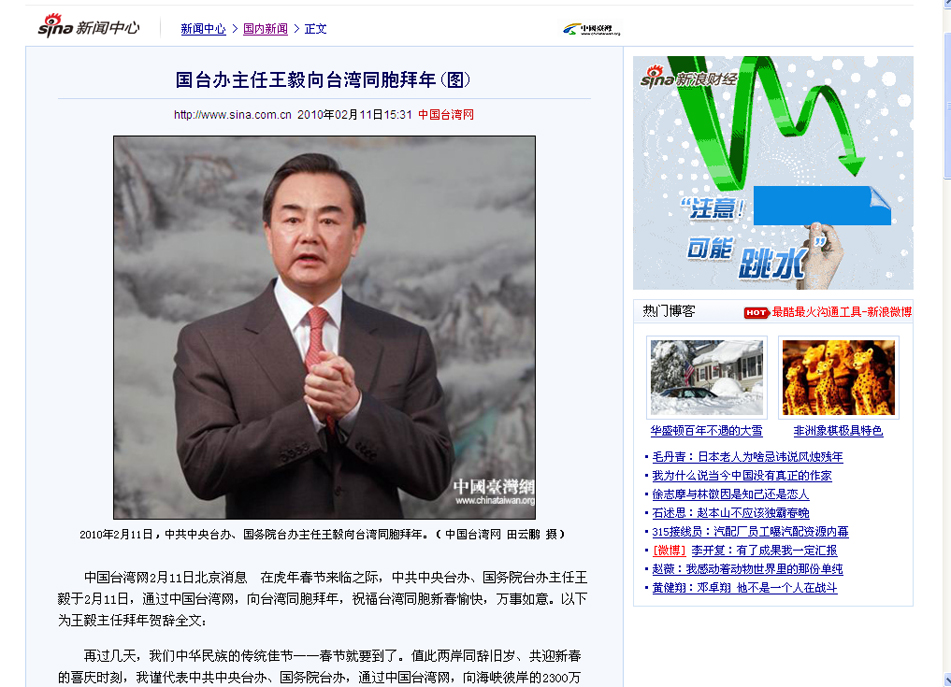 [新浪網] 國臺辦主任王毅向臺灣同胞拜年