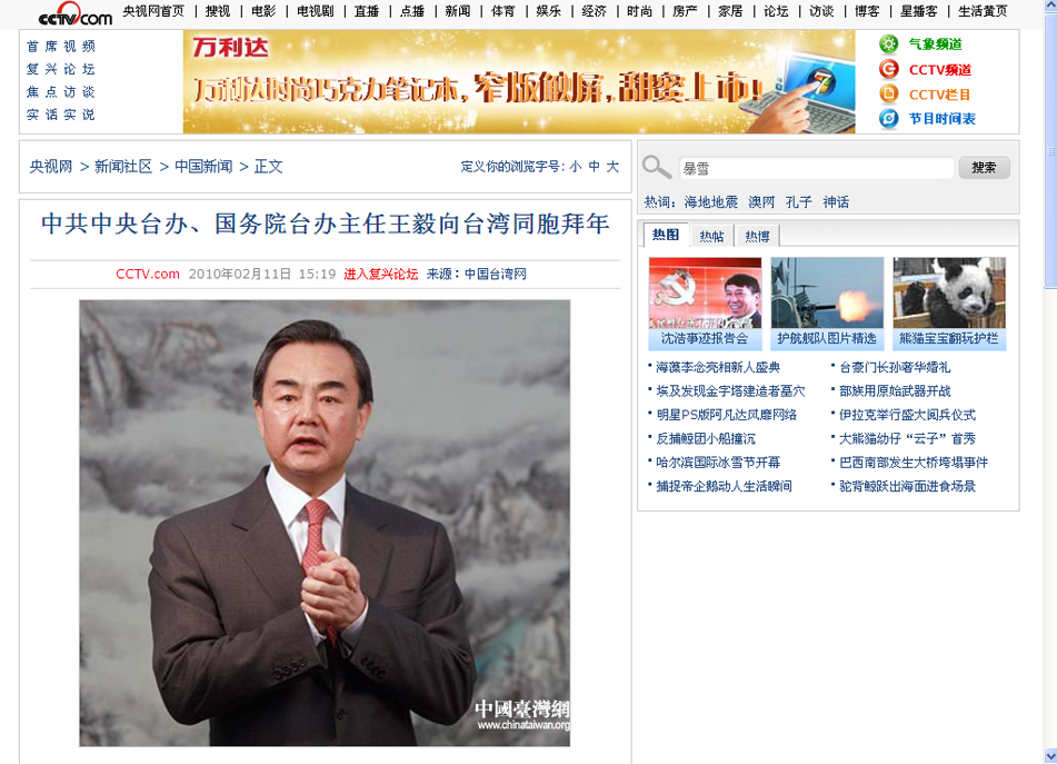 2010年2月11日,中共中央臺辦、國務院臺辦主任王毅通過中國臺灣網向臺灣同胞拜年。(中國臺灣網 田云鵬 攝)