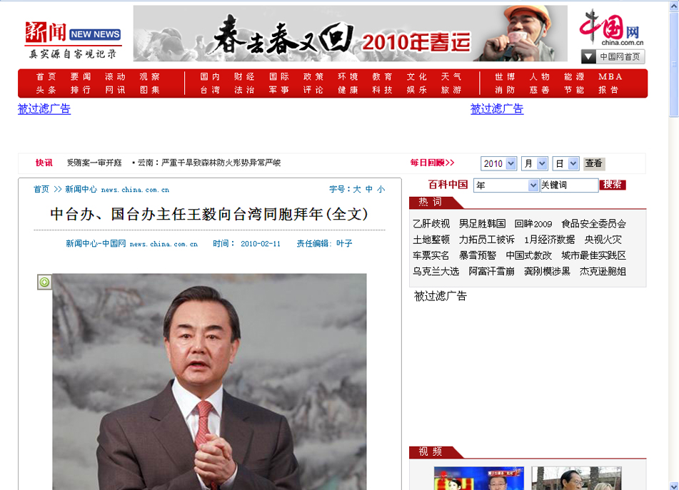 2010年2月11日,中共中央臺辦、國務院臺辦主任王毅通過中國臺灣網向臺灣同胞拜年。(中國臺灣網 田云鵬 攝)