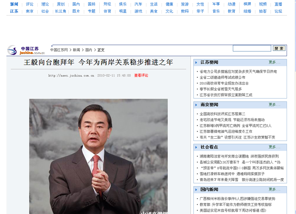 2010年2月11日,中共中央臺辦、國務院臺辦主任王毅通過中國臺灣網(wǎng)向臺灣同胞拜年。