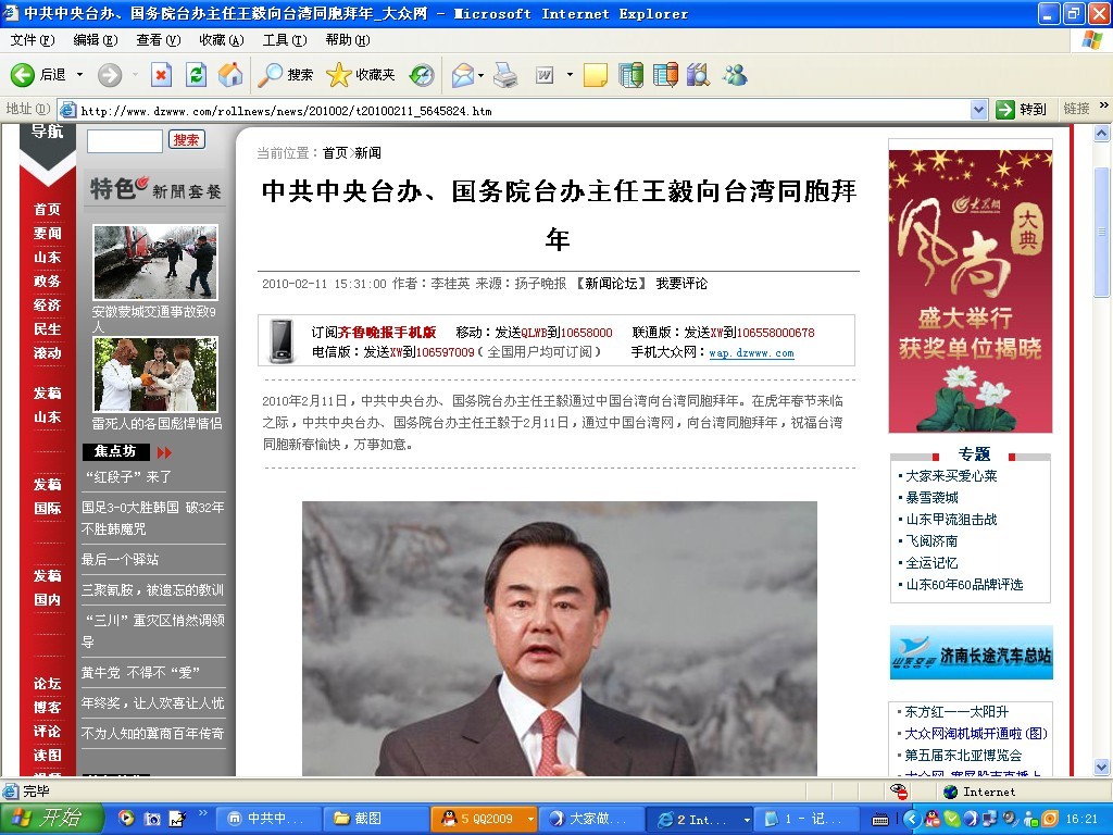 2010年2月11日,中共中央臺(tái)辦、國務(wù)院臺(tái)辦主任王毅通過中國臺(tái)灣網(wǎng)向臺(tái)灣同胞拜年。(中國臺(tái)灣網(wǎng) 田云鵬 攝)