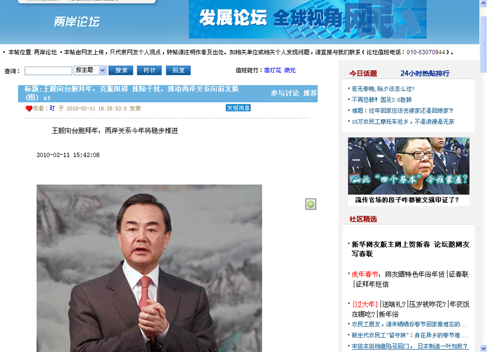 [新華網發展論壇] 王毅向臺胞拜年:兩岸關系今年將穩步推進