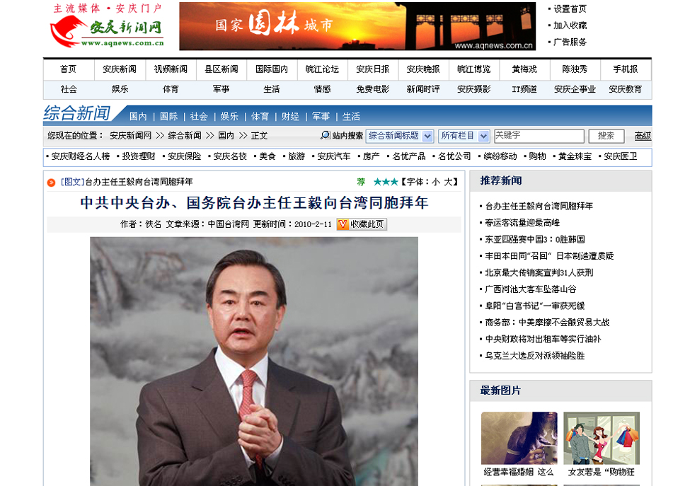2010年2月11日,中共中央臺辦、國務(wù)院臺辦主任王毅通過中國臺灣網(wǎng)向臺灣同胞拜年。(中國臺灣網(wǎng) 田云鵬 攝)
