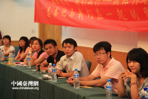 中國臺灣網(wǎng)7月13日北京消息 今天下午,作為兩岸萬名青年大型交流活動之一的兩岸青年學(xué)生“追尋歷史的足跡”參訪團(tuán)在北京大學(xué)進(jìn)行參觀交流活動,并舉行“總書記與我們在一起的那一刻”主題座談會,展開熱烈討論。胡錦濤總書記的和藹可親、平易近人,給兩岸青年學(xué)子們留下了深刻印象。