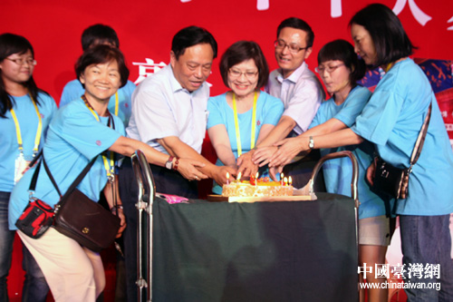 全國臺聯會長梁國揚參加臺胞千人夏令營在北京大學聯歡活動,并上臺為臺胞青年們慶祝生日。(中國臺灣網 吳斌 攝)