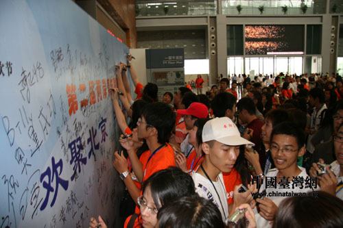 臺灣學(xué)子們爭先恐后在“歡聚北京 共迎奧運”的背板上簽名