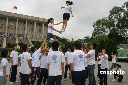 八月二十二日下午,參加“第二屆兩岸青年聯(lián)歡節(jié)·海峽西岸行”的五百名臺(tái)灣青年,來到華僑大學(xué)、泉州師范學(xué)院、泉州黎明大學(xué)、泉州一中、泉州培元中學(xué)及泉州南少林武術(shù)學(xué)校等學(xué)校,與泉州青年學(xué)生共同開展交流互動(dòng),結(jié)對(duì)子,交朋友,增進(jìn)對(duì)大陸校園文化的了解。 圖為臺(tái)灣世新大學(xué)啦啦隊(duì)團(tuán)員為華僑大學(xué)學(xué)生進(jìn)行精彩的表演。 中新社發(fā) 黃瑤瑛 攝