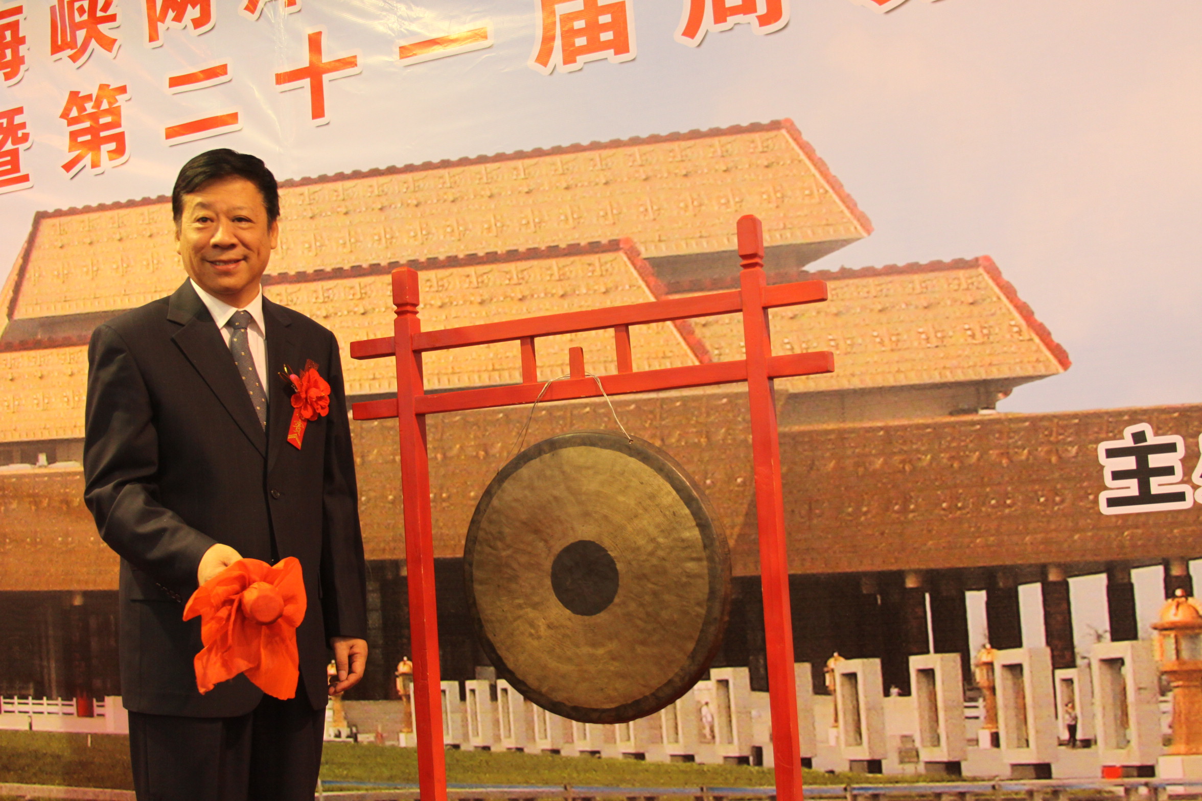 靳綏東副主席為海峽兩岸周易與現代化學術論壇暨第二十一屆周易國際討論會鳴吉祥鑼。圖片來源:河南省臺辦