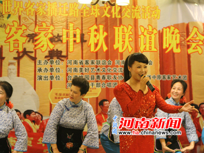 河南省中原客家藝術(shù)團歌唱家演唱的《客家山歌接親人》表達(dá)了中原人對寶島親人的好客和熱情。